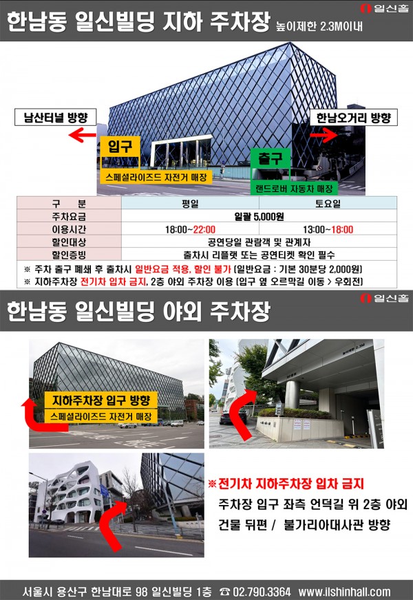 주차장 이용 및 금액은 어떻게 되나요? 페이지 정보 작성자 일신홀 작성일18-05-31 11:30 조회27,417회 댓글0건 관련링크 이전글 다음글 목록 본문 주소 : 서울시 용산구 한남대로 98(한남동 714) 일신빌딩 1층 Tel : 02-790-3364 이전글 다음글 목록